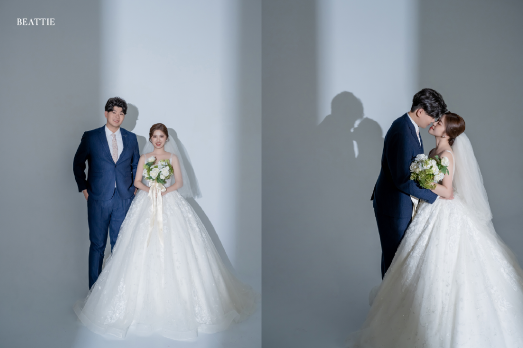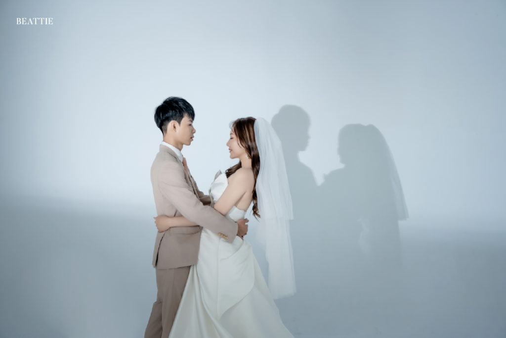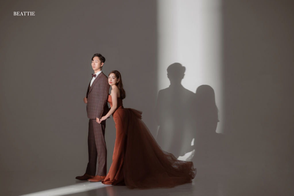 極簡拍攝不依賴背景,而是依賴光線落下的位置,光會讓笑容更真、讓眼神更亮,也會讓禮服的線條清晰地浮現,影則帶來安靜、層次與情緒的深度。
