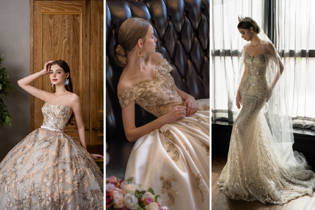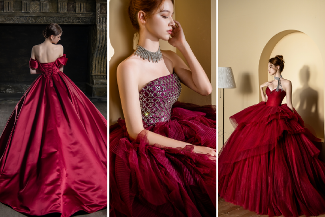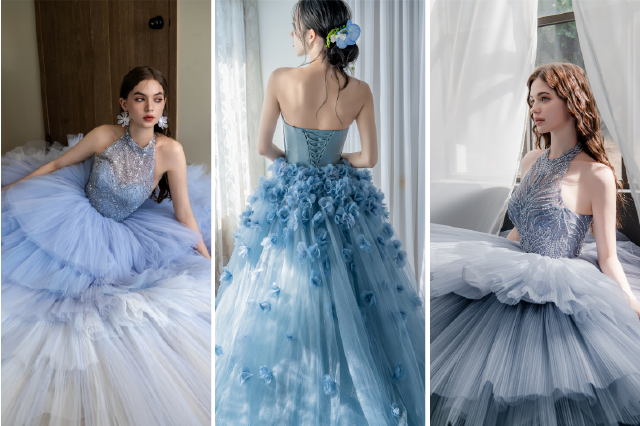禮服會在光線下讓原本細微的質地變得立體而明確,緞面的光澤、紗裙的層次、亮片的折光,都會被強化。