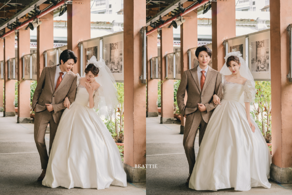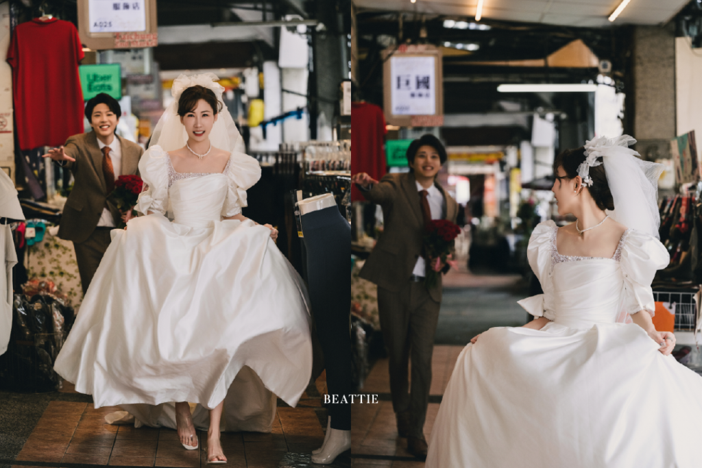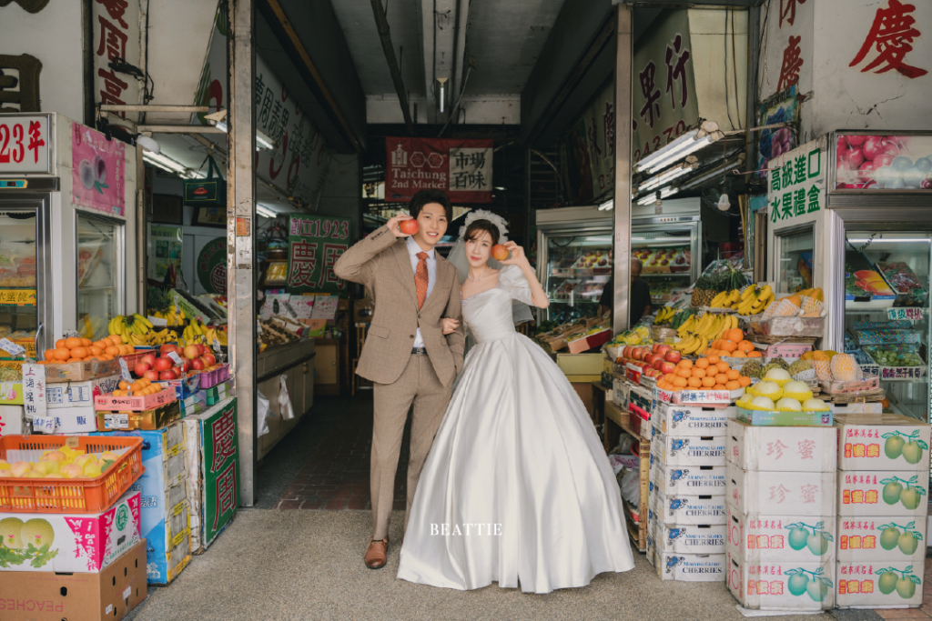 不是海邊、不是山上,而是老市場——這裡有真實、有溫度,也有最屬於台灣的浪漫,鐵窗的花紋、招牌的褪色、攤位的油光,都成了這場婚紗故事最真實的布景。