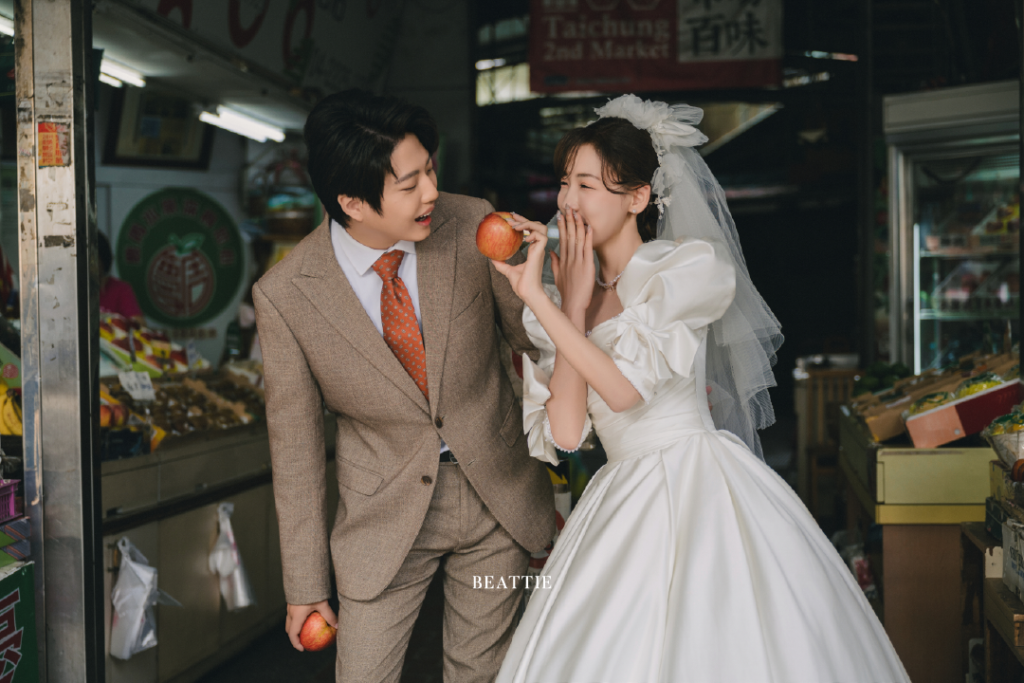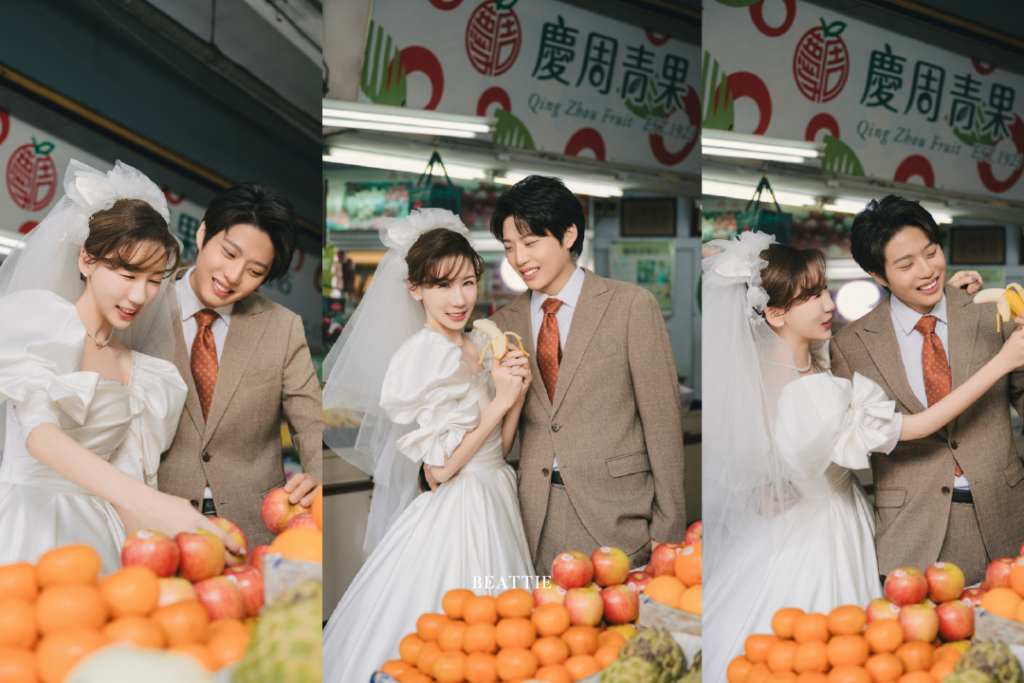 陽光透過縫隙灑下,照在橘子與蘋果的光澤上,空氣裡混著果香與潮濕的氣息。白紗在這些色彩之間輕輕飄起,乾淨卻不突兀。水果的香氣、午後的光、白紗的輕盈——她遞上一顆蘋果,他笑著接過,生活與浪漫在這裡交疊。