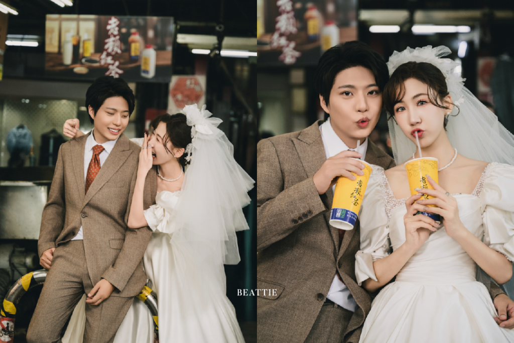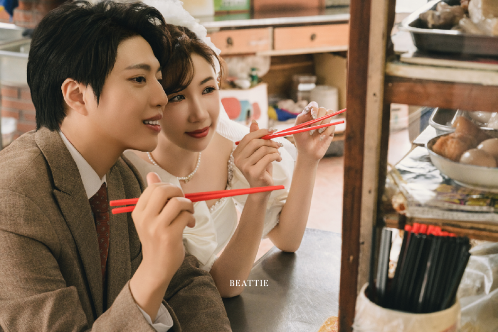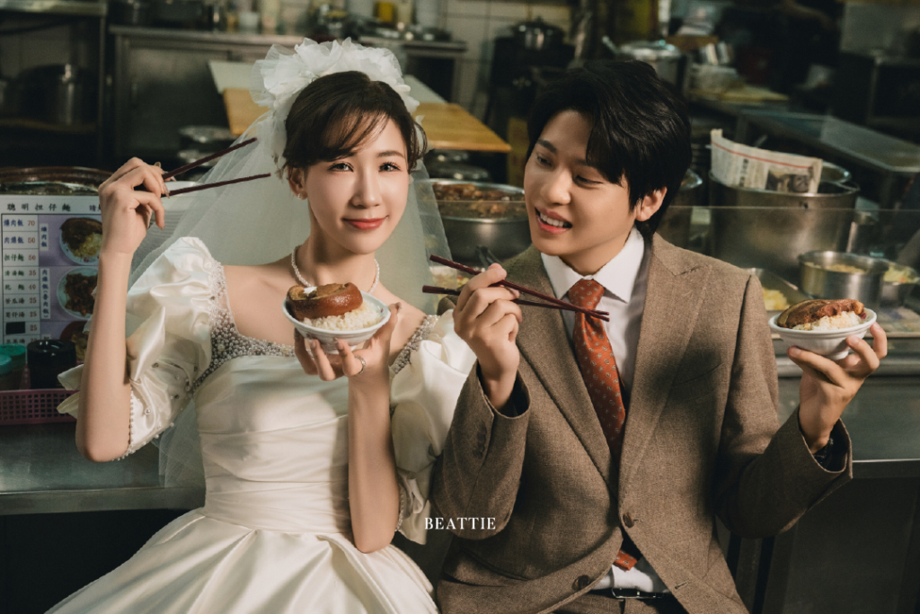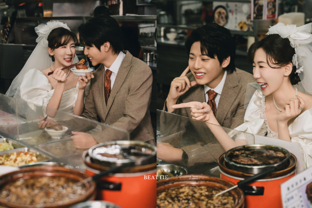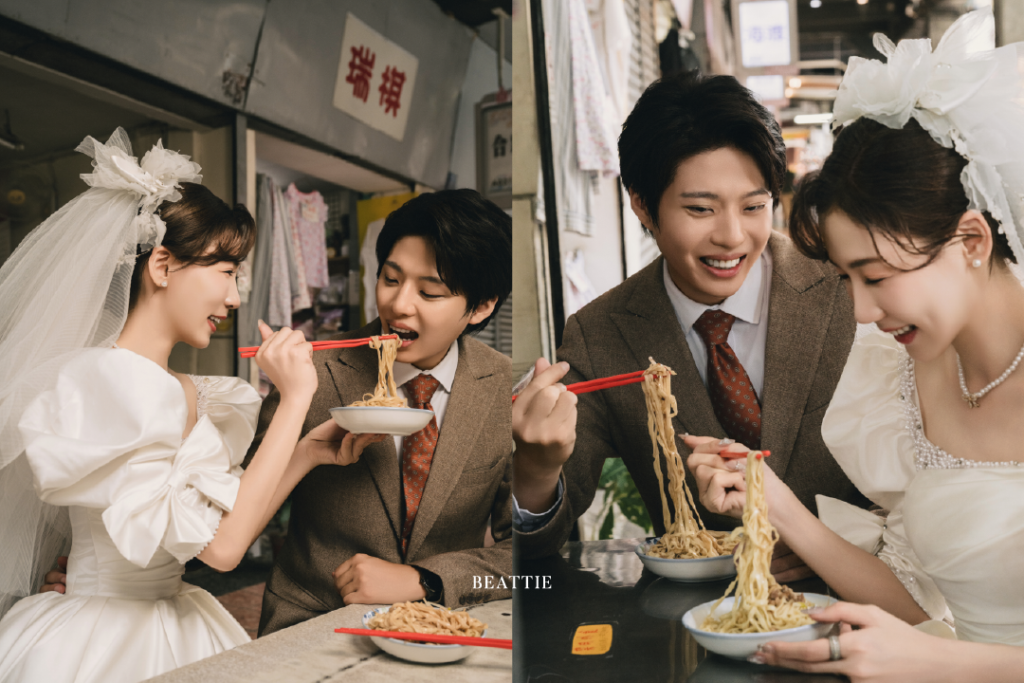 這一系列婚紗照,不刻意營造華麗布景,也不追求完美姿態,而是將新人置於這些熟悉的街景裡,用鏡頭捕捉真實的互動與生活感。從水果攤的日常甜味,到滷肉飯的煙火氣息,再到老麵店的樸實味道,雜貨店的陳設細節,手搖飲的輕鬆瞬間,以及騎樓追逐的動態片刻,每一個場景都像是在訴說一個關於台灣、關於愛情的故事。
