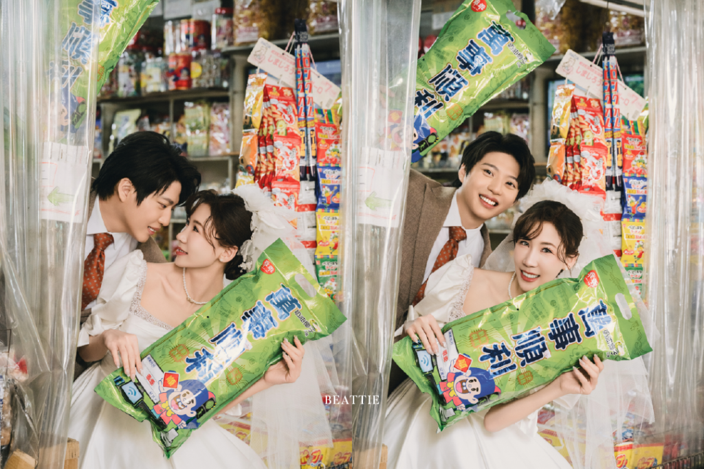 在巷口的雜貨店,鐵門已冉冉掀起,是磨石子的地板,櫃台後方堆滿了紙箱和收據,只有一盞老舊的燈條顯得昏暗。門口堆著整齊的紙箱與成排的零食、乾糧及泡麵,鋁罐飲料一層層疊高,天花板吊著電風扇,慢慢轉動。白紗垂到地面,裙邊微微沾了灰塵,他幫她整理裙擺,兩人都笑了。背景是五顏六色的商品包裝,襯托著「囍」字的紅,畫面沒有華麗的布景,卻像在記錄一段真實的生活片段。