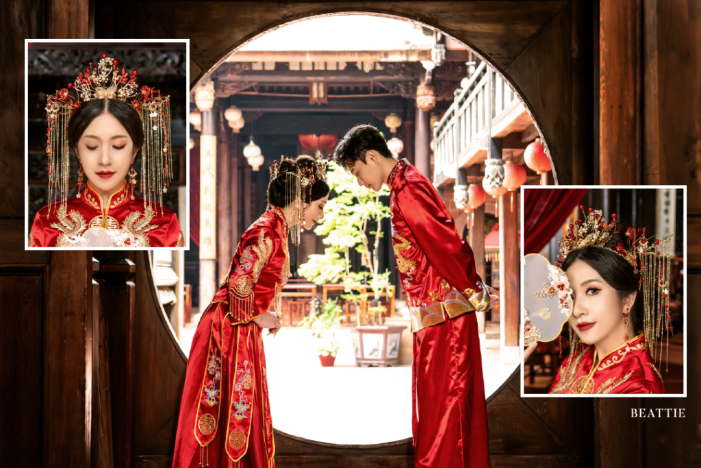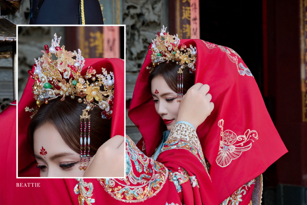 如果非常注重傳統的話,髮型上可以選擇高髻、盤雲髻、雙環髻等傳統盤髮,現代越來越多新娘造型會採用中分加上低盤髮的改良式髮型,保留古典氣質外也能讓頭型飽滿好看,也比傳統盤髮更柔和更符合現代審美。