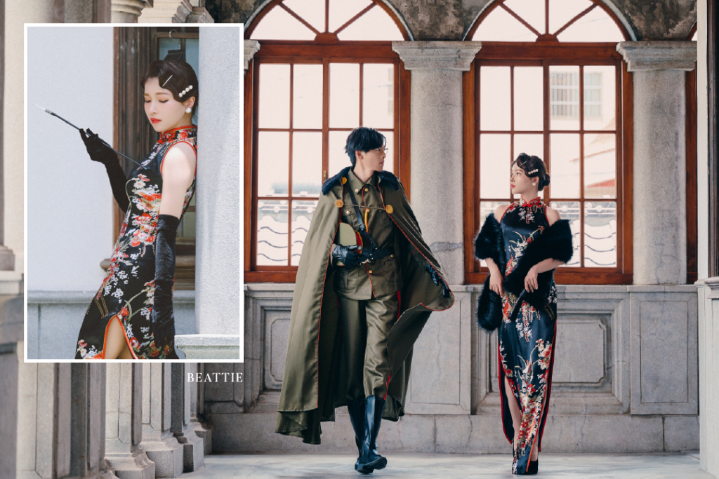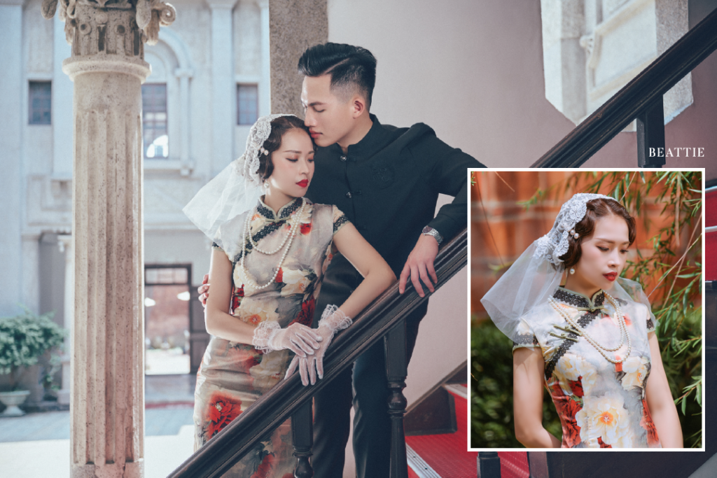 最經典的就是珍珠髮夾!因為珍珠與旗袍非常相襯,優雅但不浮誇,剛好能呼應旗袍布料的光澤感。若想要拍出比較復古摩登的氛圍,可搭配緞帶、髮帶或是繫上絲巾,或是再加上一點蕾絲的元素,保證時尚又復古!另外有小花或金屬飾針的話,適合拍外景時使用,在自然光下閃爍低調光澤,會顯得精緻許多。